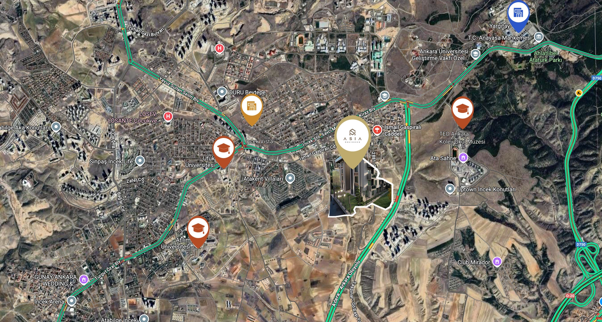 Projeyi çevreleyen eğitim kurumları, sosyal alanlar ve yerleşim dokusu, bölgenin sunduğu düzenli yaşam akışını destekler. Ana ulaşım bağlantılarına yakın lokasyonu, gün içinde pratik hareket imkanı sunar. İncek’in sakin yapısını modern bir yaşam anlayışıyla birleştiren konumu, projeyi ayrıcalıklı kılar.